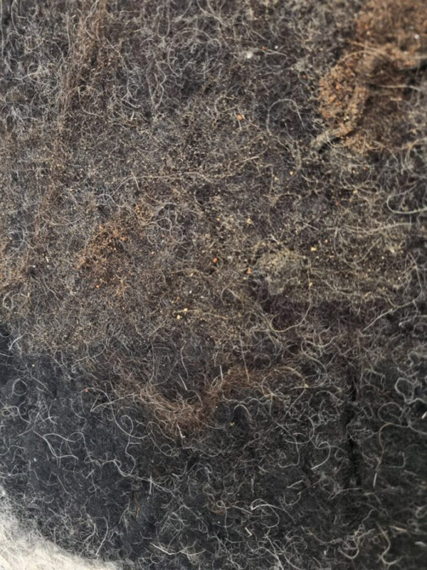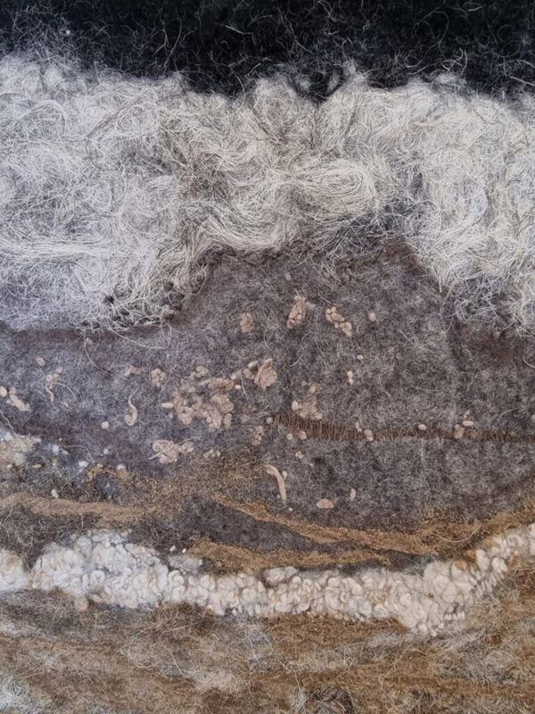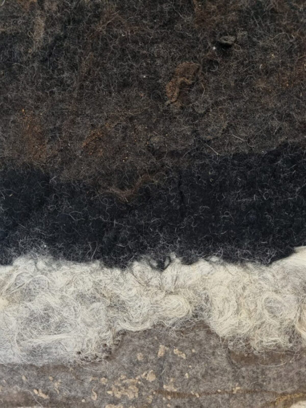 Een bodemprofiel van humusrijke grond met in het vilt vondsten van de akker. Van verschillende soorten zand uit de bodem heb ik pigmenten gemaakt en daarvan verf waarmee ik op het vilt heb gedrukt. In het vilt zie je verschillende texturen waaronder borduurwerk en roomwitte vacht van het Walliser Schwarznase bergschaap en zwartbruine vacht van het Ouessant schaap.